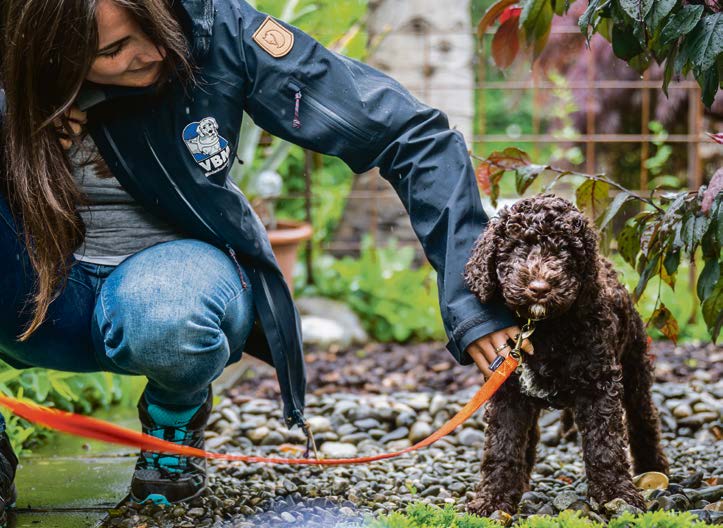 Welche Rassen kommen als Blinden- und Vertrauenshunde überhaupt in Frage? Antworten liefert die Foto- galerie am Hauptsitz der Schule, die das gängige Bild vom Labrador oder Retriever als klassischen Blindenhund sprengt. Auf den grossformatigen Porträts posieren Bergamasker, Grosspudel, Schäferhunde, Barbets, Airedale Terriers, aber auch Mischlinge wie Labradoodles (Labrador und Pudel). Die Schule, an welcher jährlich rund zwölf Blinden- und Vertrauenshunde für Menschen mit Sehbehinderungen oder Autismus ausgebildet werden, arbeitet derzeit mit über zehn verschiedenen Rassen. Mit gutem Grund: «Dank dieser Breite können wir die Bedürfnisse der Klienten viel besser abdecken – beispielsweise, wenn eine Allergie vorliegt», erklärt Nathalie Borer. Was allen Hunden gemeinsam ist: Für ihre Aufgabe müssen sie eher gross und schwer (20 – 40 kg), aber dennoch agil sein. Wenn Nathalie Borer in den Zuchtstätten nach geeigneten Welpen Ausschau hält, verlässt sie sich nicht nur auf ihr Bauchgefühl. «Wichtig ist, dass ein Welpe neugierig und menschenbezogen ist», erläutert sie. Und sie testet, wie die kleinen Geschöpfe auf akustische und optische Reize sowie Berührungen reagieren. Keine Rolle spielt hingegen das Geschlecht.