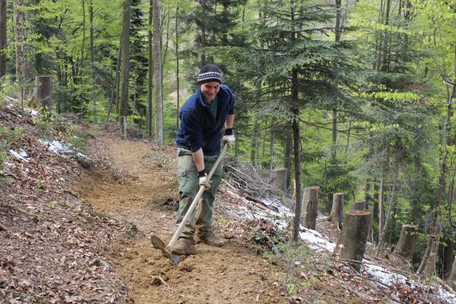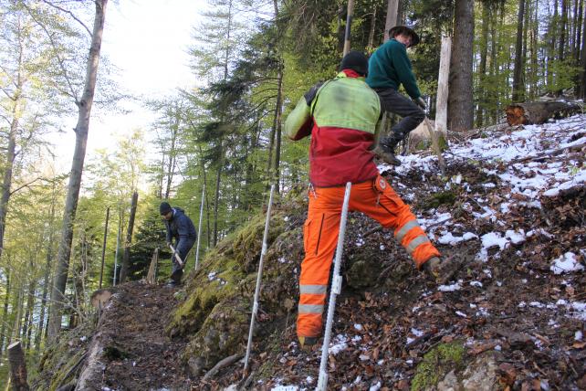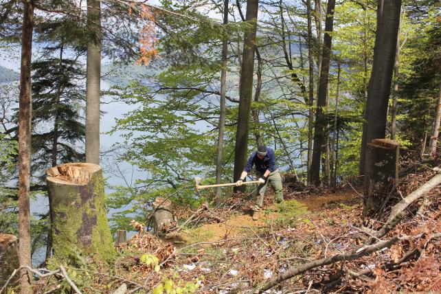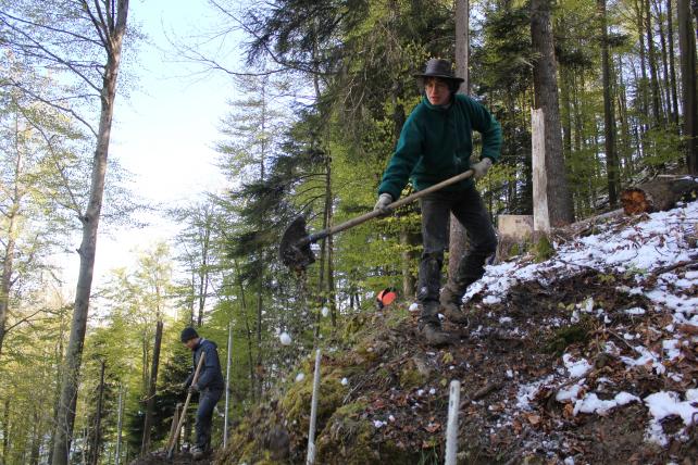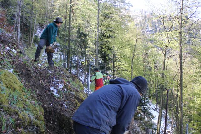 Diesen Weg sind drei Männer aus dem Bergwaldprojekt gerade am Ausbessern. Dort, wo er besonders unwegsam ist. Einer gräbt den Boden mit einem Wiedehopf um, einem Werkzeug, halb Beil, halb Hacke, das durch seine Form an «Frisur» und Schnabel des namensgebenden Vogels erinnert. Die beiden anderen stehen etwas oberhalb und schaufeln frische Erde auf den Weg. Die Arbeit hier ist schon fast erledigt. Ein dicker Baumstamm, gut am Abhang fixiert, sorgt dafür, dass künftig weder der Pfad noch der Förster absacken und zu Tal rauschen. Nur das Handseil fehlt noch, das wird später fixiert, dann kann nichts mehr passieren, zumindest hier nicht.