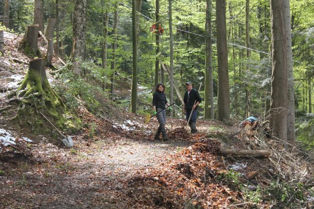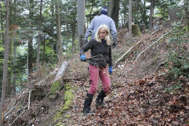 Ruedi Schmid sammelt die drei Wegbauer gleich ein, sie machen sich mit ihm auf den Weg runter, zum Mittagessen. Ein paar rutschige Serpentinen sind da noch, doch der Pfad ist angenehmer als weiter oben, hier ist er schon frisch renoviert. «Etwa alle zwei Jahre müssen die Wege freigelegt werden», sagt Schmid. Das ist keine wirkliche Naturschutz-Arbeit, die die Freiwilligen hier erledigen, doch sie erleichtert dem nächsten Team oder dem Förster die Arbeit im Wald.
