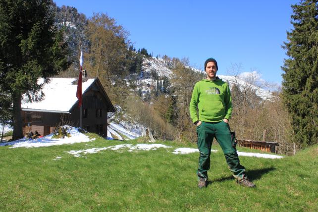 Während die Köchin auf dem Bänklein vor der Hütte (ein Massenschlag für die Teilnehmer, kein Strom, fliessendes, aber kaltes Wasser) schon fürs Znacht rüstet, macht sich Ruedi Schmid auf den Weg in Richtung Mittagessen. Runter, tief in den Bergwald hinein. Der Schnee der letzten Tage hat die schmalen Pfade aufgeweicht. Dort, wo er schon geschmolzen ist, versaufen die klobigen Schuhe im Matsch, wo er sich noch gehalten hat, rutscht Schmid trotz Traktorprofilen bedrohlich in Richtung Abhang. Der Weg ist steil. Kein Wanderweg, ein Forstweg, höchstens.