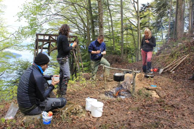 Auf einer kleinen Lichtung haben sich die restlichen Freiwilligen versammelt. Ein schwerer Suppentopf hängt über einem Lagerfeuer, darin dampft es. Apfelschnitze und Käsestücke werden verteilt, Suppe wird geschöpft. Die Mittagspause ist wohlverdient und wird um Punkt zwölf eingeläutet. Grund genug für die paar deutschen Projektteilnehmer, einen gut gemeinten Scherz über die Schweizer Pünktlichkeit fallen zu lassen.