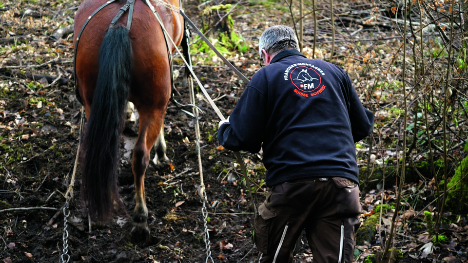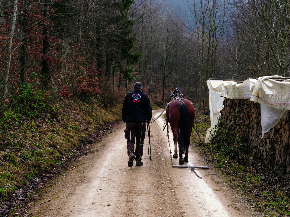 Nirwana rundet den Hals und blickt zu Boden. Ihre Hinterbeine rutschen ganz langsam den steilen, matschigen Hang hinunter. Hinter ihr knackt es. Ernst Rytz umschlingt einen Holzstamm mit einer Kette und befestigt ihn an der Waage. So heisst die Stange, welche Nirwana hinter sich über den Boden schleift. Die zehnjährige Stute schnaubt. Sie ist konzentriert bei der Sache. Der 65-Jährige steht links neben ihr und nimmt die Leitseile auf. Die Stute marschiert los. Ernst Rytz ist gelernter Werkzeugmacher und Landwirt in Pension. Wenn er arbeitet, dann mit seinen Pferden. Von einer baselländischen Gemeinde hat er einen Auftrag für Waldarbeit, die er nicht mit der Maschine, sondern mit seinem Hafermotor erledigt.