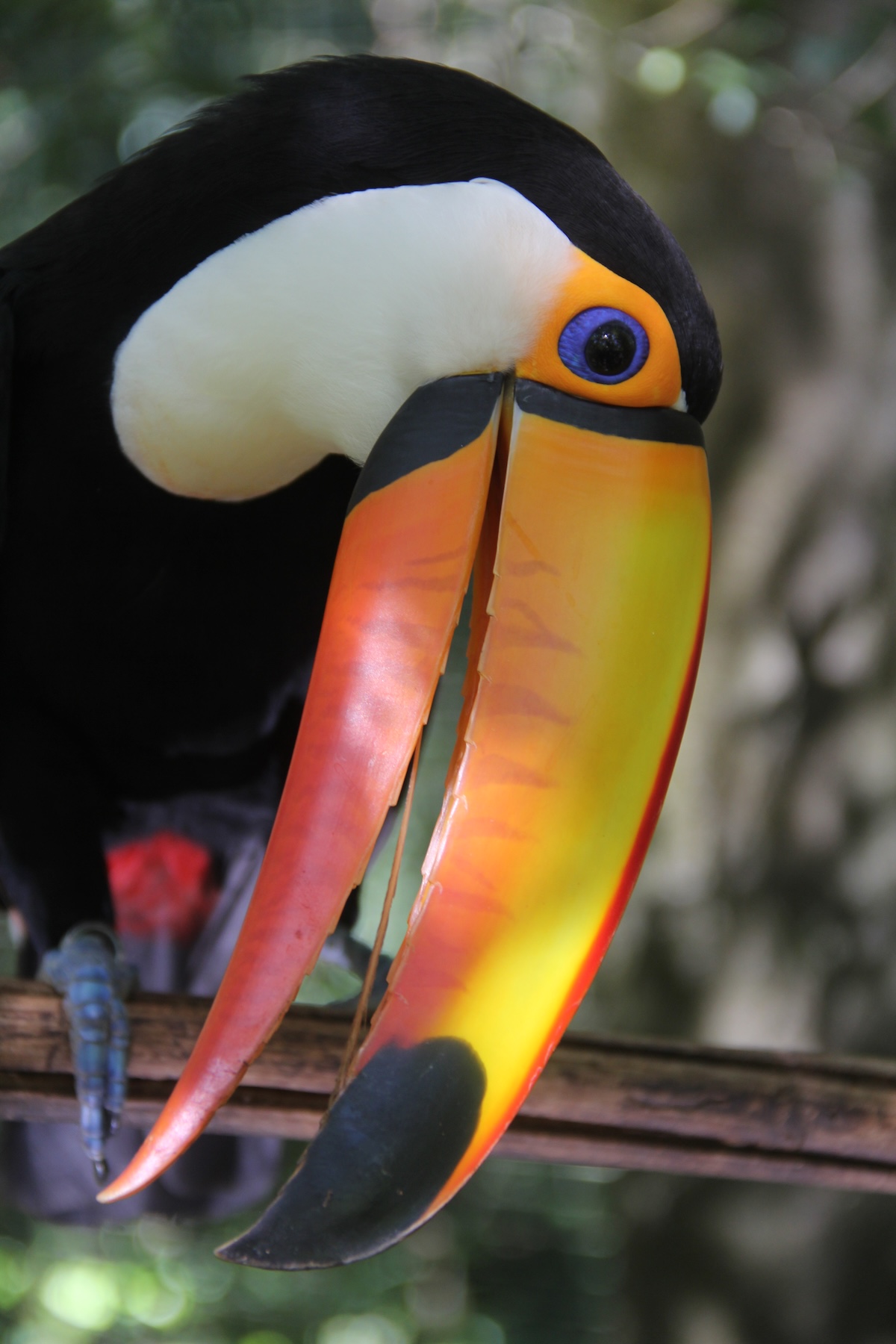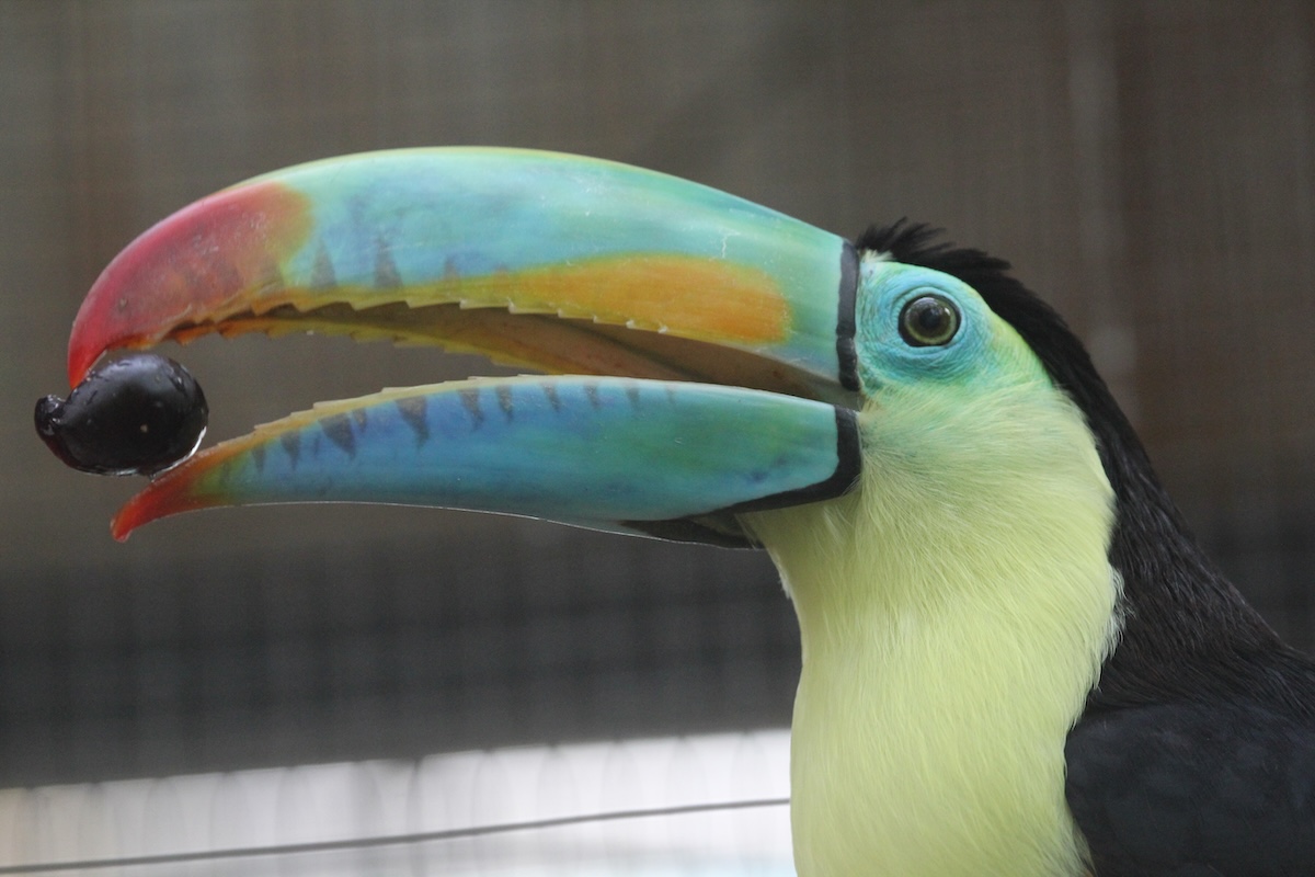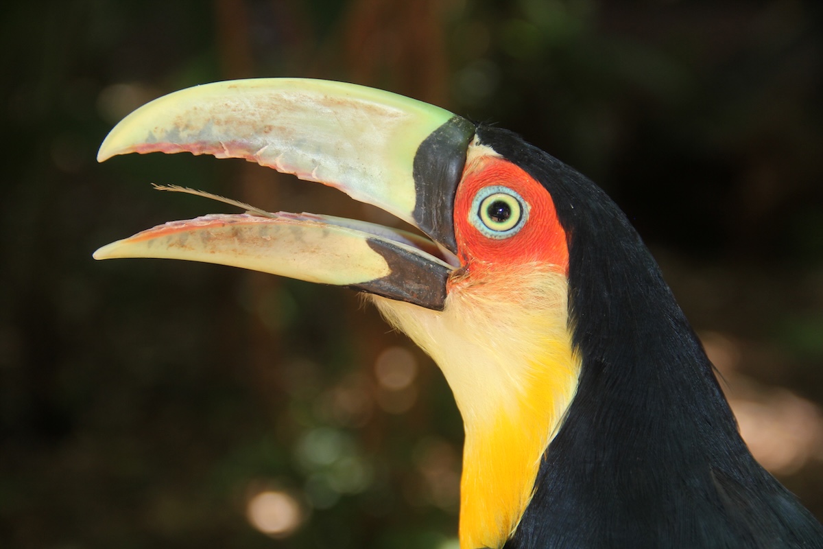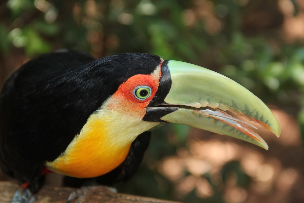 Im Parque das Aves in Foz da Iguaçu in Brasilien werden in begehbaren Volieren zahlreiche Tukane, beispielsweise Riesen- und Bunttukane, gehalten. Viele wurden von Hand aufgezogen und sind ausgesprochen zutraulich. Sie sitzen auf dem Geländer und lassen sich sogar kraulen. Manche baden genüsslich in der Sonne. Von Nahem lässt sich auch ihre dünne, lange Zunge sehr gut sehen.