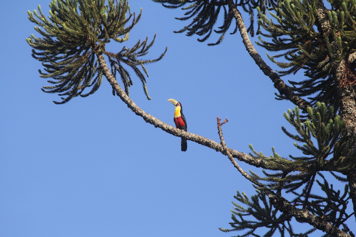 Obwohl der Bunttukan der kleinste Vertreter der Eigentlichen Tukane ist, zieht auch er in der Natur die Blicke auf sich. Er flattert in der argentinischen Provinz Misiones, ganz im Norden des Landes, in den Baumkronen der urtümlichen Araucarien.