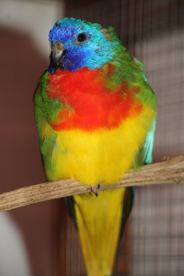 Wildfarbe: Männchen: leuchtend blaues Kopfgefieder, rote Brust, gelber Bauch, Oberseite grün. Weibchen: fahles Blau am Kopfgefieder, grünlich bis grünlich-gelbes Gesamtgefieder