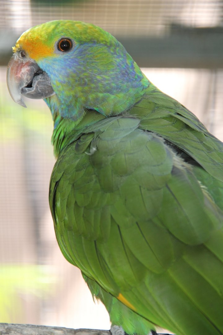 Wildfarbe: grün, orange Handschwingen, bläuliche Federn im Kopfbereich, Stirn gelb