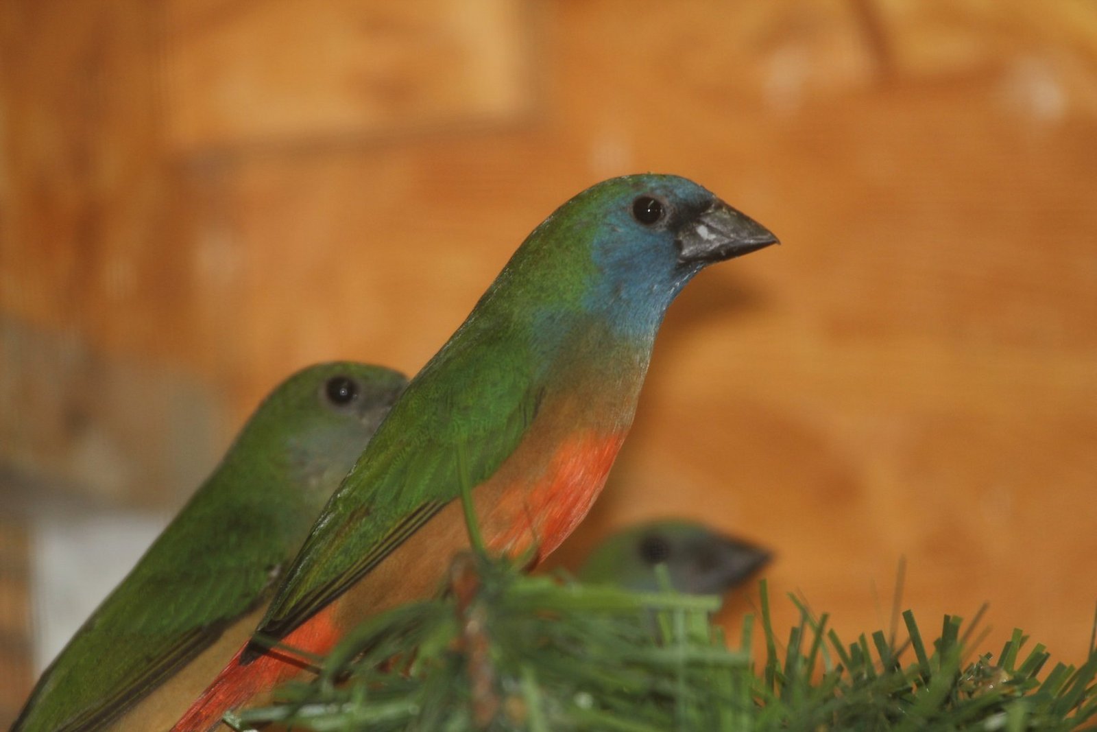 Alle Papageiamadinen weisen auffallende Gefiederfarben auf. Die Lauchgrüne Papageiamadine tritt dabei besonders hervor. Ihre Federn wirken wie die ineinander verlaufenden Farben eines Malers auf einer Mischtafel. Sie gehen vom Blauen ins Dunkelgelbe über und laufen in einem geschmackvollen Orange aus. Eine prächtige Papageiamadine, die selten gehalten wird.
